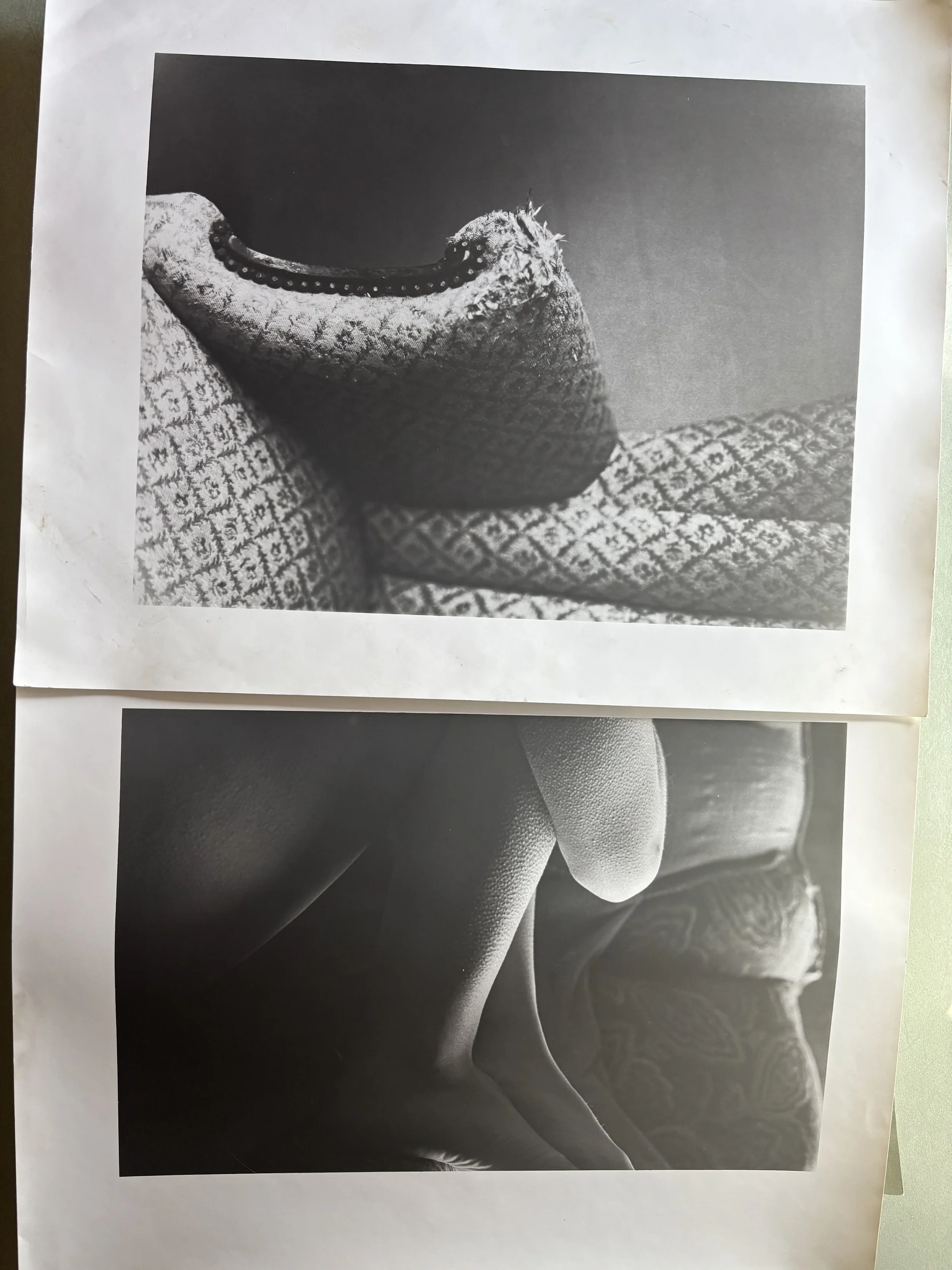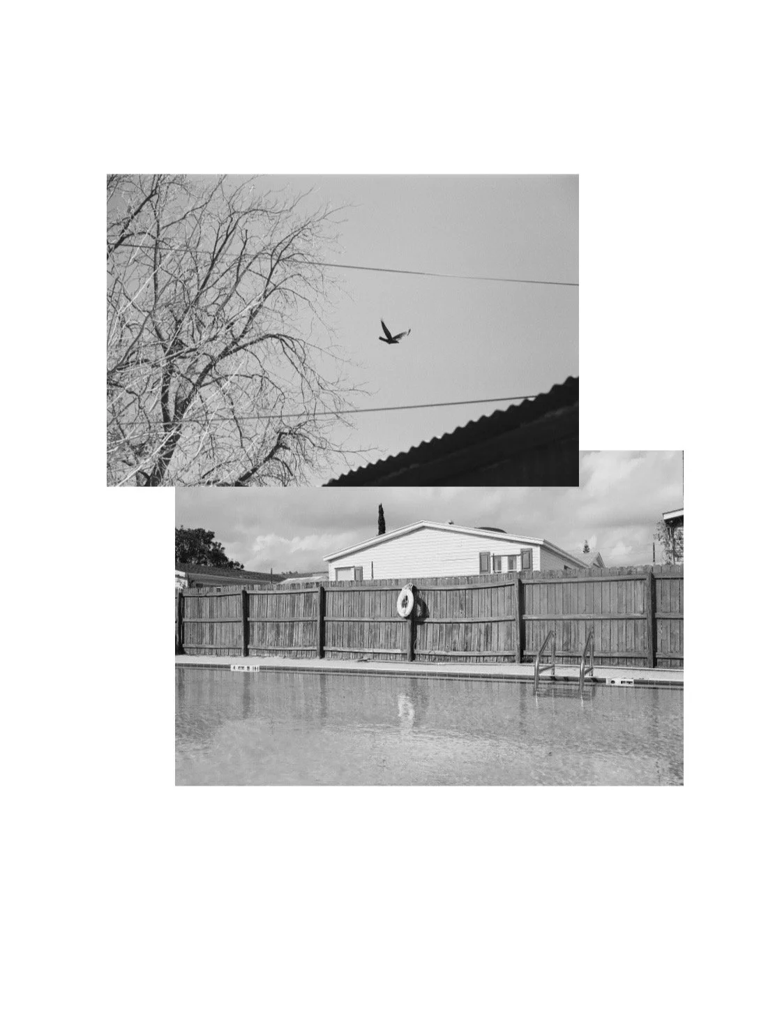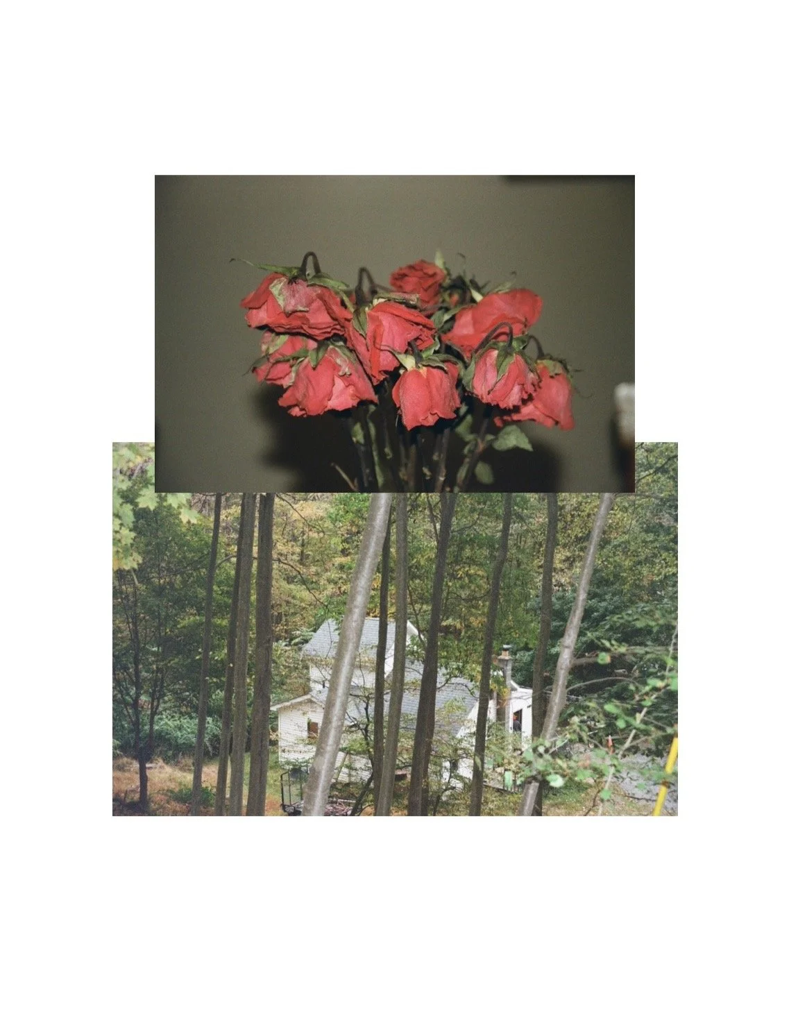 My recent photographic works explore the emotional landscape of home. I collaged jean textile as a frame for images, using denim as both material and metaphor. The fabric evokes protection, labor, familiarity, and Americana—something worn, touched, and lived in. Against this tactile border, I placed film photographs of domestic spaces alongside symbols and omens: a house, an empty pool, a raven; and a house receding through the woods with dried roses. Elements that create a juxtaposition of belonging and isolation. These photographs were taken on 35mm film in New York and Florida while with family. The houses I photographed are partially obscured—behind a fence or set deep in the country, distanced by trees. They suggest safety, yet also secrecy. Together, these works consider how home is shaped by time, both within and without. Home is not only a structure, but a feeling formed by memory, landscape, and the symbols we attach to place. It is a space we return to, even when we cannot fully see it.