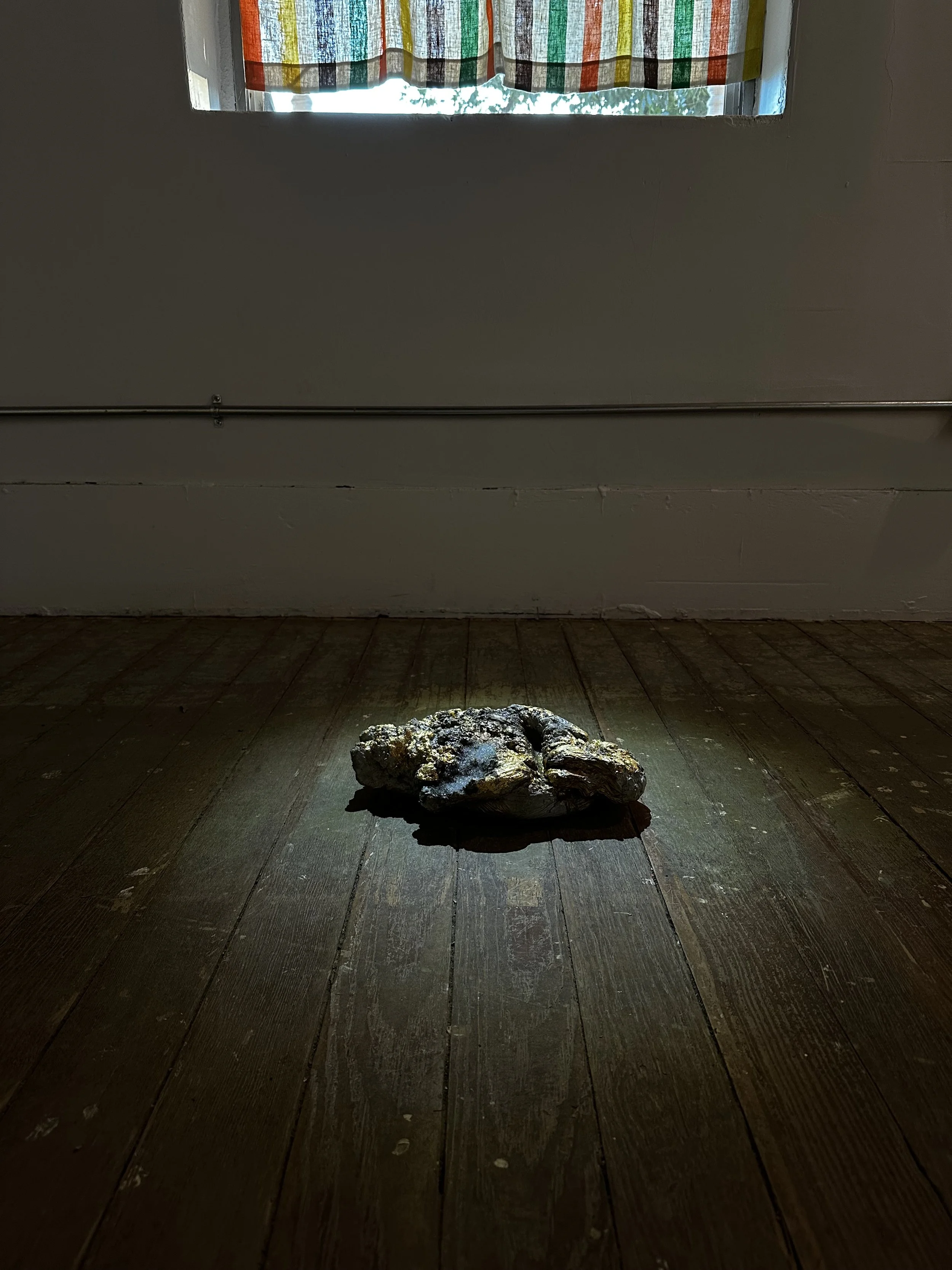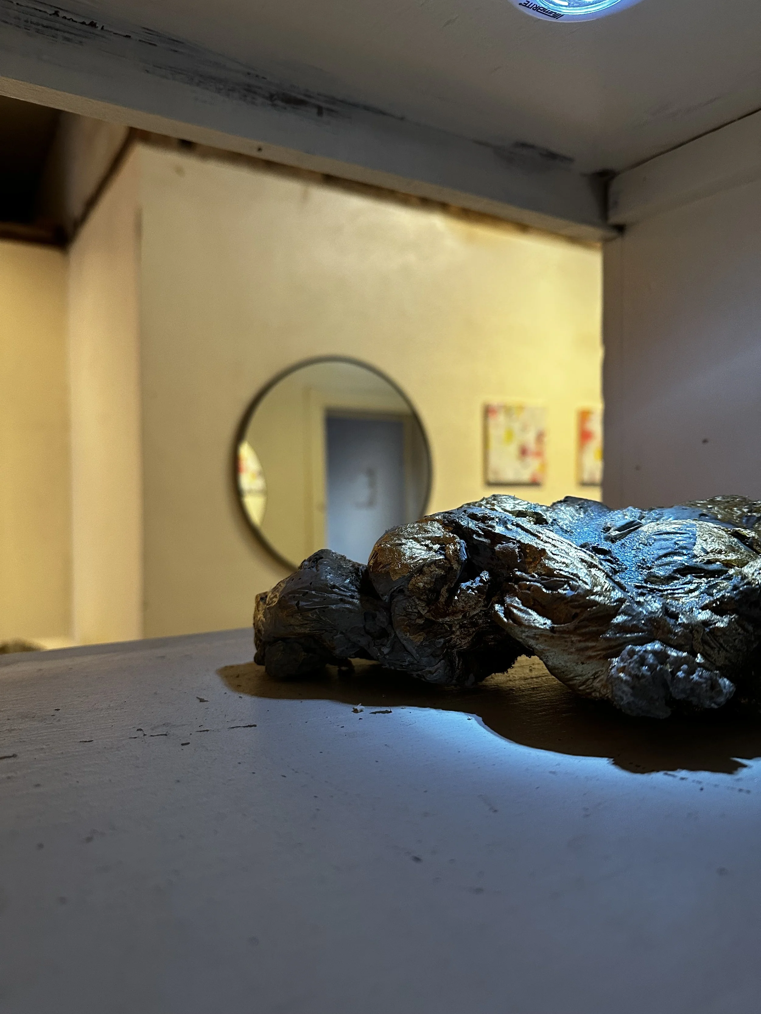 Perihelion Gaze invokes an astronomical condition: a body at its closest approach to the sun, where gravitational pull and orbital velocity converge in a moment of maximum intensity. Cement, beeswax, glass beads, and gold leaf/dust are composed into a gravitational chord, each exerting its own force while altering the behavior of the others. This expanded material constellation continues the work of Mazurek’s Radical Chimeras, where three or more wholly disparate entities merge into an almost impossible coalescence, a material becoming that exceeds the sum of its parts. Known for an expansive body of work that traverses sound composition, improvisation, painting, drawing, and installation, Mazurek engages here with sculpture as both an extension and a reframing of his core concerns: the distillation of form to its most intrinsic forces, the orchestration of disparate elements into coherent-yet-impossible unities, and the sustained interrogation of perception as a generative act.